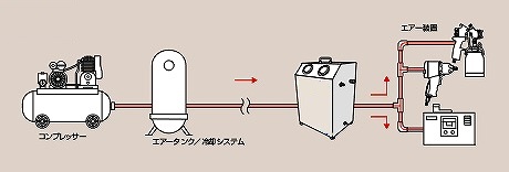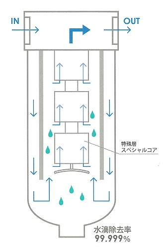 | ■特徴 ●ほかのエアドライヤーよりも、簡単で確実に水分除去します。 ●節電、ランニングコスト0円 ●会社にやさしい 地球にやさしい ハイブリット方式 ●構造、原理 衝突分離による除去を経てエアーは「スペシャルコア」の通気孔に向かっていくが、非常に細いために不純物を含んだエアーは通気孔を通れず、ほとんどのエアーは下部方向に逆流し押さえつけられる。 これによりクリーンなエアーだけが「スペシャルコア」を通っていく。 衝突分離を経て、水滴、油滴、塵を除去したエアーは、「スペシャルコア」を通るときにエアーの容積と流速、圧力が変化し「断熱膨張」が起き、内部の気圧が低下し温度が下がることで結露をする。 ※連続的な、流量・圧力によって効果が異なります ![]() ■外観図 ![]() ■設置例 ![]() ■仕様