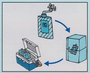 ■使用方法 ①水道蛇ロを注水ロに挿入します。 ②注水ロを手で押さえてから注水します。(数分でゲル状になり、流出しにくくなります。) ③平らな状態で冷凍室に入れ、よく凍らせてから御利用下さい。 ![]() ■適正 ●日々の使用量にバラツキがあったり消費量が読みにくい場合、在庫ス卜ックがしやすい。 ●最大重量まで吸水させれぱ、保冷能力は大きくなる。 ●1回使用向き。 ![]() ■仕様