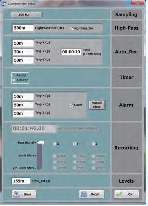 スタンドアロンでもPC接続でも使えるマイクロ・データロガー。 ![]() ■特長 本器は加速度振動、衝撃や傾きを記録することができる、新世代のスマートデータロガーです。 3軸MEMS加速度計、正確な日付/ 時刻クロックおよび64MB または128MB の記録用不揮発性メモリから構成されています。 設定に応じて数ヶ月間の振動加速度信号およびRMS レベルを記録することができます。 超小型設計のため、被測定物に貼ったり、監視対象機器の中に埋め込むことができます。 ●3- 成分 MEMS 加速度計内蔵 ●加速度振動の計測と記録: ○時系列データ(gまたはm/sec2) ○統計値(最大値、最小値、平均値) ○振動レベル(dB またはLin) ○傾斜データ(°) ●完全デジタル設計です。 ●オシロスコープ機能を内蔵し振動を実時間表示。 ●振動記録中でも記録済みデータの観測が可能。 ●スタンダローン動作と PC とのUSB 接続で計測設定やデータ伝送が可能。 ●USB から充電可能な長寿命リチャージャブルバッテリ内蔵。 ●参照信号として重力加速度(g)を利用した自己1g 校正が可能。 ●加速度信号100%(ミスサンプル無し)の観測と記録が可能。 ●Auto-Rec 機能: 数ヶ月間に渡り休眠状態から、加速度信号が設定した閾値を超えた場合 にのみ記録可能。 ●複数の本器を容易に管理できる編集可能なカスタムIDを設定することができます。 ●防滴構造でシールされています。 ●メーカーのドライバが用意されています。 ●データ後処理用アプリ(スペクトル、フィルタリング等) が実装されています。 ■アプリケーション ●加速度振動、衝撃、振動のRMS レベルの長期計測と記録 ●設備機器等の動作状況及び精密機器の輸送環境のモニタリング ●機械摩耗の連続モニタリング/ 回転設備機器や風車などのCMS ●構造物の長期振動応答モニタリング ●長期傾斜モニタリング ■周波数応答 ●高域周波数応答 本器はアンチエリアジングフィルタを装備していません。 図1 は加速度計の周波数応答@ 3.2 kHz サンプリングレイトでの特性です。 ●低域周波数応答 低域応答周波は、必要に応じて、デジタル高域通過フィルタ(HPF) によって制限することができ ます。カットオフ周波数は調整可能であり、フィルタが高分解能のため非常に低い周波数に調整することができます。図2 は、1Hz(緑)、5Hz(赤)と10Hz(白)カットオフでの応答であり、3.2 kHz のサンプリング周波数で調整したHPFの低周波応答特性を示しています。 ![]() ■マネージャアプリ仕様