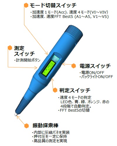 ISO10816-3に準拠した、設備診断用のペンシル型簡易振動計です。 速度rmsによる軸受の『よさ判定』を4段階のLED色で行います。 加速度と速度を同時に計測し、周波数分析結果(各BEST5)も表示し、ミスアライメントの判断に役立てることもできます。 | ペンタイプ振動計 品番 M2537PE-211V 価格は下記をご覧ください。 |