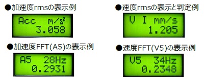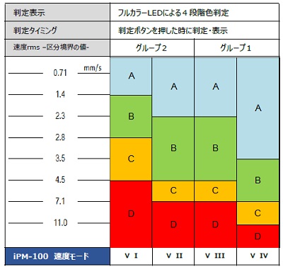 ■特長 ・設備の日常保守を担当される技術者向けのISOシビアリティ判定機能付振動計です。出荷の際には基準校正器(159Hz、10m/s^2)で感度校正を行っておりますので安心してご使用になれます。 ・誰にでも手軽に簡易計測が可能 ・コンパクトで狭い場所でも手が届く ・計測/判定が早い (1秒以内) ・測定時の押付圧を一定に調整 ・個人差のない高品質の測定を実現 ・ISOシビアリティ判定機能搭載 ・4段階の色で即時判定 ![]() ■機器本体、寸法図 ※材質 ABS,色は青と白の2色 ![]() ![]() ■表示部 ![]() ![]() ■ISO判定概要 速度モードにて判定 ![]() 「よさ判定」例 A: 良 B:可 C:警告 D:危険 ※ グループの分類 : グループ1 大型機械 出力、300kW~50MW グループ2 中型機械 出力、15kW~300kW ■仕様