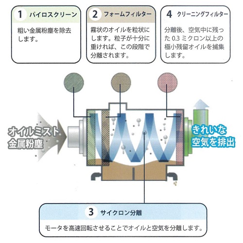 ■特長 ●工場内を常に清潔に 金属加工時に工作機械内で発生するオイルミストは、放っておくと場内が汚れ、制御機器のトラブルにつながりかねません。 本機は強力な吸引力で発生したオイルミストを99.9%まで捕集。メーカー独自のサイクロン方式でオイルと空気を分離した後、HEPAクラスのクリーニングフィルターを通して油煙レベルまで取り除いたきれいな空気を排出します。 ●設置もお手入れも簡単に 軽量、コンパクトな本機はあらゆる工作機械に簡単に設置できます。 フィルターは汚れたら交換しましょう。(※)カバーの開閉はトルグラッチで手軽に行えますので、メンテナンスに時間はかかりません。 ※フィルターが汚れると性能は著しく低下します。使用環境によって汚れ具合は変わりますが、フィルターの定期的な清掃点検と「1年ごとの交換」をおすすめしています。 ※交換用品としてフォームフィルターとクリーニングフィルターを用意しております。 ![]() ■仕様
