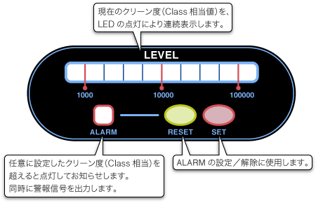 | ■特長 本機はエアロゾルセンサに表示などのインタフェースを追加した製品です。 0.5ミクロンm以上の浮遊粒子を高感度に安定検出し、清浄度クラス相当値(クラス100相当から100,000相当まで)を10段階表示します。 クリーン状況を確認したい場所に設置することで、現在のクリーン度(Class相当値)を表示で確認でき、警報設定も可能です。また、イーサネット出力により既設のLANをそのまま使ったネットワーク構築が可能です。 ●パーティクルカウンターと比較校正 ●ファンレス・軽量・コンパクト ●アラーム設定とバーグラフ表示で簡単連続モニタリング ●光源異常時のアラーム表示が可能 ●出張作業によるセンサ交換に対応 ●イーサネット出力により既設のLANをそのまま使ったネットワーク構築が可能 ●オプションで計数値表示も可能 ・クリーンルーム粉塵モニター用ソフト(M2591K505-V3R)を使用することでモニタリング可能(最大160台) ・データ収集、リアルタイムリスト、グラフ表示、ファインリング並びにプリンタ出力がコンピューターを使用して行えます。 ■使用用途 清浄度クラス100 ~ 100,000レベルでの簡便な浮遊粒子濃度モニターを必要とする場所 ■外形図(mm) ![]() ■表示部 ![]() ■本体下面説明図 ![]() ① LAN端子 LANケーブルを接続し、ネットワーク内のハブやPCに接続することでデータ収集が可能になります。 ② AC電源入力端子 付属のACアダプターからの端子を接続します。 ■本体右側面説明図 ![]() ③ リセットスイッチ 本体動作を強制的に初期(電源投入直後)状態に戻すためのスイッチです。 ④ ロータリースイッチ アラームを出力させるポイントを設定するスイッチです。ドライバーなどで回転させて設定します。 ■本体取付方法説明図 ![]() ⑤ 壁面取り付け金具 設置する際に、壁面取り付けが容易な設計になっています。 ■モニタリングシステム接続例 ![]() ■仕様 (0.5μm調整)