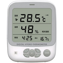 ■M2D-6796A ![]() ●温度、相対湿度または絶対湿度、熱中症指数または露点、時刻を一覧表示 ●温度・相対湿度の上限と下限アラームを設定可能、LEDとブザーでお知らせ(ブザー音オフ可能) ●相対湿度と絶対湿度を切替表示 ●熱中症指数と露点を切替表示 ●露点の管理、塗装などの乾燥過程に ●実験室、作業環境の温湿度管理に ●熱中症と季節性インフルエンザ対策に ●壁掛と卓上の2通りの設置が可能 ※本製品は屋内および屋外で太陽照射のない場所で使用するよう設計されています。 ※本体は防水構造になっておりません。雨や水がかかるような場所ではご使用にならないでください。 ■仕様