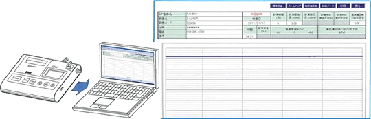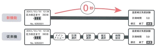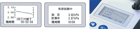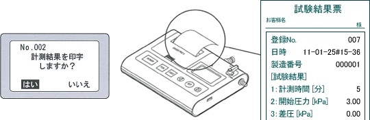 ■特長 ●計測がスピーディになりました。前回の設定条件ですぐに計測が始められます。 ![]() ●計測中の圧力変化を確認できます 微少な圧力変化を捉え、デジタル・グラフ表示します。 ![]() ●登録データをいつでも印字 プリンタを内蔵していますので、計測した結果をその場で印字できます。また、計測結果を登録しておけば、何度でも印字が可能です。 ![]() ●パソコンにデータを転送して計測結果を管理 パソコンに転送したデータは、エクセル形式のデータ管理ソフトで閲覧・保存等が可能です。 ![]() ●合計400件まで計測・登録 気密試験・温度補正気密試験・漏洩検査・温度補正漏洩検査ロガー計測・現在の圧力、共に合計400件の計測・登録が可能です。各計測の混在も可能です。 ●容量50リットルまでは温度補正モードで計測 配管の測定圧力は周囲温度に影響されるため、測定結果によっては判断に迷う場合があります。 ![]() 右下のグラフにおいて、一般的には、青線部分の圧力低下のみで漏洩判断していますが、本機は試験前に配管内の圧力変化(赤線部分)を計測することにより、温度による圧力への影響を予測し、実際の計測結果と予測値を比較して、漏洩を判定します。 ![]() ■仕様