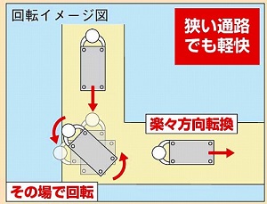■特徴 ● クイックターン仕様の採用。 六輪車の中央2輪が固定車のため、その場で台車を回転することが可能。 大きな台車でもスペース最小限で方向転換できます。 ![]() ● 回転半径が従来の四輪車と比べて1/2以下で回ります。 ![]() ■外寸図 ![]() ![]() ■仕様