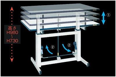 | ■特長 ●停止時均等耐荷重100kg ●ガスバネで昇降が非常にスムーズ ●使用場所を選ばない「パールホワイト」カラー の作業台です ●ストロークは余裕の250ミリ、あらゆる作業に適しています ●高さ730~980mm の範囲で任意の高さに調整でき、無段階で高さ調節が可能です。 ●足で踏むだけでストッパーがかかりますので、頻繁に高さを変える場合でも全く煩わしさがありません。 ●ガスバネ式なのでメンテナンス不要。油漏れの心配もありません。 ![]() ●操作方法 ① テーブルを水平に引き上げる。(又は押し下げる) ② 任意の位置でストッパーを踏み込みロックさせます。 ※ 再度高さ調整をされる場合はストッパーを手前へ戻し、①②の操作を繰り返して下さい。 ![]() ■寸法図 ●M350GS-096WS ![]() ●M350GS-127WS ![]() ■仕様