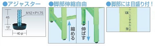 | ■特長 ●本体寸法 ![]() ![]() ![]() ●中板均等耐荷重:200kg ●アジャスター ●脚部伸縮自由 ●脚部には目盛り付 ※ 脚部には目盛りが入っているので、調整が簡単に行えます。 ![]() ■仕様