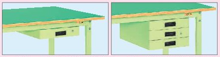 ■オプション <キャビネット> ![]() ●引出し寸法 ![]() ※仕切板の取付けはできません ●キャビネットの取り付け ・作業条件に合わせて、左右最適な位置にセットしてお使い下さい。フロント・バックどちら側でも取付けられますから、対面での作業にも最適です。 ・キャビネットは最大4個まで取付けられます。(但し、同位置の(前・後)には取付けできません) ![]() ●仕様