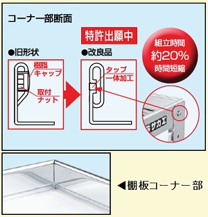 ●メーカー独自の堅牢構造「突合せ内蔵方式」 ![]() ●棚板断面図 棚板の立ち上げ部分は下図のような構造になっており、 非常に堅牢です。 ![]() ●組み立て性の向上 棚板本体にタップ加工を行うことで ナットが必要なく、組み立て性を大幅に向上させました。 (メーカー比20%組立時間短縮) ●安全性の向上 上部に丸みを持たせることで、清掃時の安全性をアップしました。 ●美観の向上 ナットを使用しないことで樹脂キャップが不要になり、 棚板内側の美観が向上しました。 ![]() ■仕様