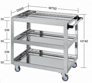 ●ステンレス製ワゴンです ●均等耐荷重、120~200kg ●棚板厚:1.0mm ●キャスターは、ストッパー付2個 ●SUS430 |