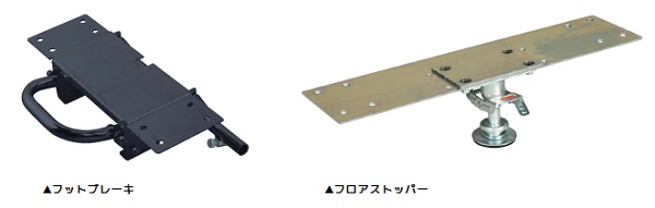 ■オプション ![]() ●フットブレーキ ※自在キャスター2個、固定キャスター2個タイプ用 今お使いのワゴンに取付けることで、フットブレーキ付になります。 ●フロアストッパー オプションフロアストッパーをご使用の際は、 自在2・固定2のキャスターの状態でご使用下さい。 |