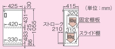 ■特長 ●ロック部分には南京錠を付けることができます。(南京錠は別売りです。) ![]() ●上段はガスバネで天蓋を上げることにより、又、下段は棚がスライドして前へ出て来ることにより、出し入れがスムーズにできます。 ●通気孔付 ●本体有効寸法 ![]() ■タイプ