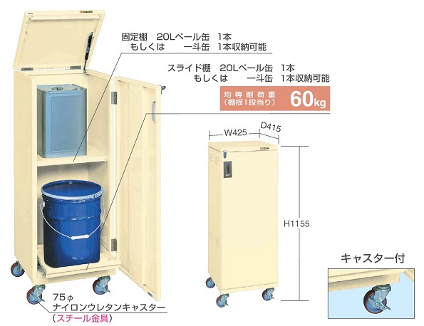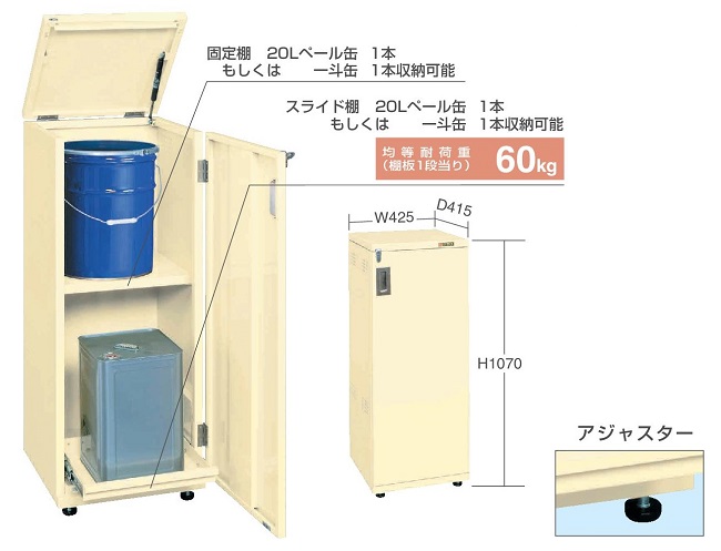 ●一斗缶&ペール缶兼用保管庫(スチールタイプ) ●均等耐荷重(棚板1段当り) 60kg ●完成品 ●粉体塗装 |