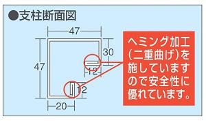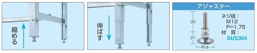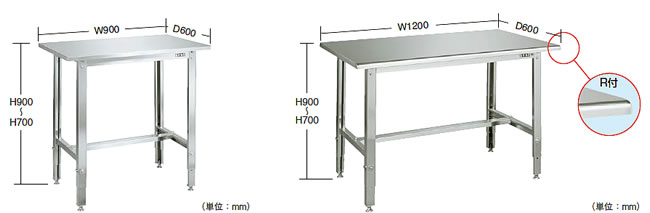 ■特長 ●支柱断面図 ヘミング加工(二重曲げ)を施していますので安全性に優れています。 ![]() ●ステンレスSUS430タイプ 天板・脚フレーム・ビーム・カンヌキ=SUS430 No. 4仕上げ アジャスター・ボルト類=SUS304 ●ステンレスSUS304タイプ 天板・脚フレーム・ビーム・カンヌキ=SUS304 No. 4仕上げ アジャスター・ボルト類=SUS304 ●脚部伸縮自由 任意の位置で高さを固定できます。 ![]() ●高さ700~900mm の範囲で任意の高さに調整可能 ![]() ●ステンレス天板・・・耐食性を兼ね備えたオールステンレス天板です オールステンレス作業台は耐久性抜群です。汚れもサッとひと拭きで末永くご使用いただけます。 ●ステンレス天板(R付)・・・美観に優れるハイグレードステンレス天板です 天板の前後がR付の為、美観に優れます。左右はフラットな為横に並べられます。 ![]() ■寸法図