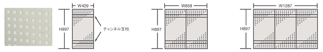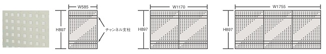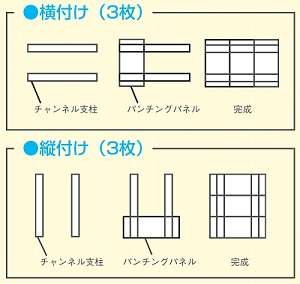 ■特長 パンチングパネル専用のウォールタイプです。すべてシステム化され、サイズも豊富です。 ジョイントはタテ・ヨコ自由自在。用途に適したハンガーフックを組み合わせることにより、作業環境の整備や管理がスムーズに行えます。 ![]() ■取付け使用方法 ●チャンネル支柱を使用する場合 ![]() 1. チャンネル支柱に取付ビスを5mm程度隙間を空けてつけます。 2. パンチングパネル側に取付穴があるので、下記イラストのように大きい穴の部分に取付ネジを通してから、小さい穴へとパンチングパネルをスライドさせて、あとは取付ネジを締めます。 ![]() ●横付け(3枚)、縦付け(3枚) ![]() ●直付けの場合 壁面にパネルを直接、ネジ等で取付けます。 ※縦・横どちらの向きでも取付けできます。 ![]() ■