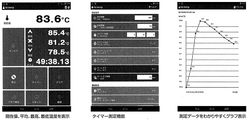 ■特長![]() ■専用アプリの機能(GooglePlayにて無料ダウンロード可能) ![]() ・温度値(リアル、平均、最大、最小)表示機能 ・表示ホールド機能 ・タイマー測定機能(測定時間設定、スタートストップ(リセット)) ・リセット機能(最大、最小、平均温度のクリア) ・データ記録機能(測定データの記録、グラフ表示、消去) ・オートパワーオフ時間設定機能、オートパワーオフ有効/無効設定機能 ・温度上限/下限警報機能 ・バッテリー残量表示、ローバッテリー表示 ・エラー表示機能(通信エラー・測定範囲外を含む) ・温度上限/下限警報でSMS送信通知機能(データSIM必要) ・音、バイブレーション、音声によるユーザー通知機能(音声はOSによる) ・測定サイクル設定機能(測定・記録別々に可) ■仕様