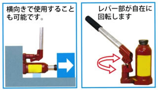 | ■特長 ●レバー回転安全弁付きのポータブル油圧ジャッキです。 ●操作部の差込ソケットが自在に回転。 後方に障害物等がある狭い場所でも障害物をかわしてポンプ操作が可能です。 ●オーバーロードを防ぐ安全弁を備え作業時の安全性を高めています。 ●防災資材としても最適です。 ![]() ■タイプ