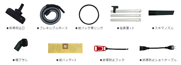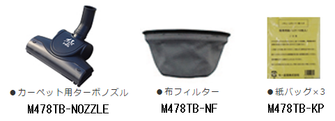 ■特長 ●わずか4.3kgの軽量タイプのため移動がスムーズ。 階段の上り下り、手に持ちながらのお掃除も簡単、ラクに行えます。メーカー従来品より約30%軽量!コンパクト ![]() ![]() ●強・弱無段階のパワーセレクト機能搭載(運転音55~65dB) 時間や周りを気にせず清掃が行えます。 ![]() ●ホコリをしっかり吸い取る最適な吸引作業を重視して設計されました。最大1200Wのパワフルモーター。 ![]() ●付け替えるだけでアップライト型並みの集塵力を実現! (オプション:カーペット用ターボノズル M478TB-NOZZLE) ![]() ●標準床ノズルでは難しかったパイル奥に入り込んだ汚れを除去 標準床ノズルではカーペット奥の汚れをキレイに取り除くことは困難でした。 本機の強力な吸引力でブラシを回転させ、カーペットのパイルをたたき、絡みついた髪の毛や埃を除去します。 ![]() ■標準付属品 ●床用吸込口 ●フレキシブルホース ●紙パッグ用リング ●延長管×3 ●スキマノズル ●棚ブラシ ●紙バッグ×3 ●断線防止フック ●断線防止ショトケーブル ![]() ■仕様