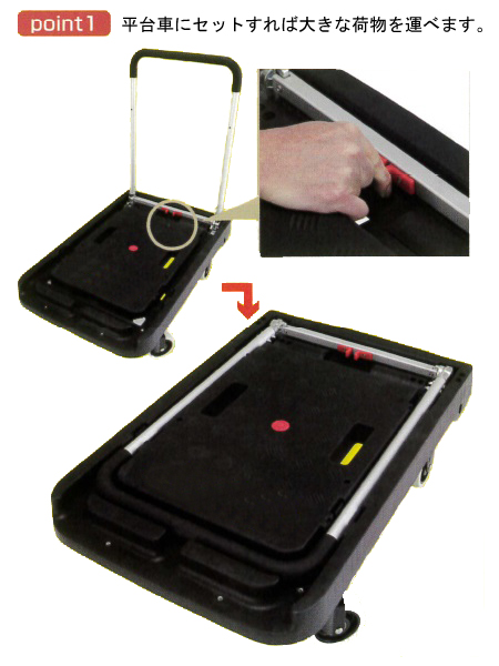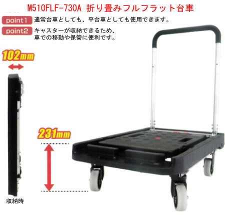 キャスターが収納できるコンパクト台車。 | 折り畳みフルフラット台車 品番 M510FLF-605A 価格は下記をご覧ください。 |