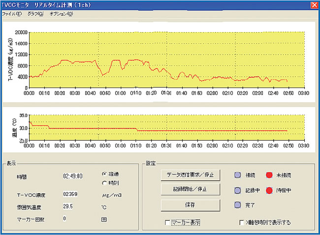 TVOC濃度・温度・湿度・マーキングタイミングをパソコン上でわかりやすく表示