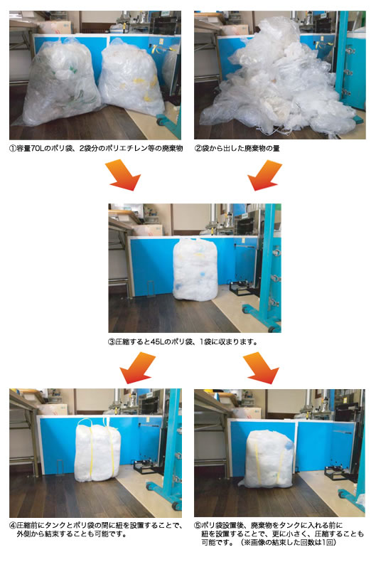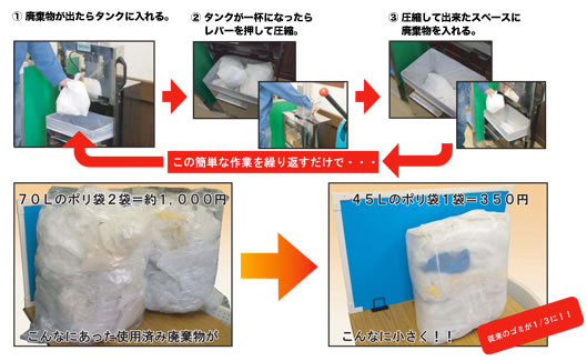 | ■特長 ●小型で軽量であるため、場所をとらずどこにでも設置が可能 ●キャスター付きで一人でもカンタン移動 ●袋詰め式なので一般事業系廃棄物(オフィスゴミなど)の圧縮に最適 ●カバーが開いている時は動作しない安全設計 ※エアシリンダー圧縮方式のため、エアーコンプレッサーが必要になります。 ■驚きの圧縮力 ![]() ■使用方法 ![]() 1、開閉扉両側面の取っ手を持ち、上部に引き上げ、安定する位置まで扉を奥に押し込んで下さい。 2、圧縮容器を引き出し、圧縮物を入れて下さい。(圧縮容器は市販の45Lポリ袋に対応しています。) 3、圧縮容器を元の位置に戻し、開閉扉を閉めて下さい。 4、押しプレート操作スイッチを下げるとプレートが下がり圧縮を開始します。 5、充分に圧縮が完了したら、押しプレート操作スイッチを上げ、プレートを上昇させます。 6、開閉扉を開け、圧縮容器を引出し、圧縮された物を取り出します。 7、圧縮容器、開閉扉は必ず元の位置に戻して下さい。 ●その他にもイージープレスにはこんな特徴が! ※抗菌コーティングにより、細菌の繁殖を防ぎ、防臭効果を高めるコーディングがしてあります。 ※1年間の保証付きだからトラブルも安心 ■用途 ●オフィスで出るシュレッダー屑やコピー用紙など嵩張るゴミの圧縮 ●オフィスビルでのゴミ処理費用削減 ●小規模店舗・事務所でのゴミ処理費用削減 ●嵩張る食器トレイゴミがでるフードコート・シネコンなど ■仕様