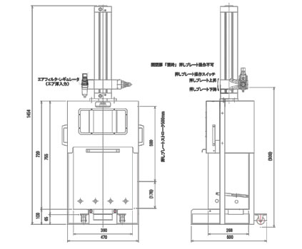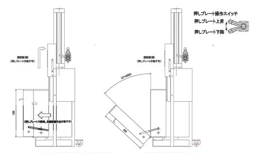 ■寸法図 ![]() ![]() ●開閉扉 両側面の取っ手を持ち、上部に引き上げ、安定する位置まで扉を奥に押し込んでください 開閉扉は平行を保ち、移動してください。 ●圧縮容器 容器全面の取っ手を持ち引き出して下さい。 両側面のパッチン錠は、容器を手前に引き出した時に開閉を行って下さい。 押しプレートが上昇位置及び開閉扉が開いている時に、圧縮容器を引き出せます。 開閉時には手や物を挟まない様にご注意下さい。 ●押しプレート操作スイッチ スイッチハンドルの操作はハンドルの端まで確実に動かしてください。 スイッチ操作を行う時は、開閉扉を確実に閉めてから行ってください。 ■注意事項〜製品を安全にご利用頂く為に、下記の内容にご注意下さい。〜 1、エアフィルタ・レギュレータにコンプレッサーを接続し、エアフィルタ・レギュレータの設定値は、 0.2MPa〜0.5MPaの範囲内で御使用下さい。 2、開閉扉・圧縮容器及び各可動部分に手や物を挟まないようご注意下さい。事故の原因となります。 3、押しプレート操作スイッチは、開閉扉が確実に閉まった状態で操作して下さい。 4、圧縮容器のパッチン錠は確実に閉めた状態でご使用下さい。 5、押しプレート作動時に開閉扉を開けないでください。 6、開閉扉を開けている状態で、押しプレート操作スイッチを操作しないで下さい。 7、長時間圧縮した状態で、放置しないで下さい。 8、圧縮操作中にエアチューブを外さないで下さい。 9、圧縮物を均等に入れ、片寄りを避けて使用してください。また、硬質な物は圧縮出来ません。 無理な動作は故障及び破損の原因となります。 |