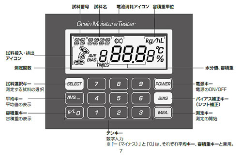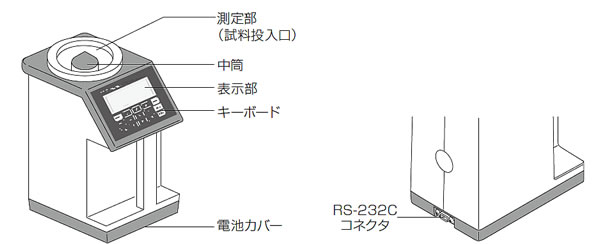 ■対応試料![]() ■特長 ●広い測定範囲 1~40%という広範囲の水分測定ができますので、多種多様の試料が測定対象になります。 ●自動補正機能 本体内蔵の質量計と温度センサーによる自動補正が行われ、正確な水分測定ができます。 ●試料はそのまま注ぐだけ 殆どの試料で粉砕などの事前準備は不要で、非破壊でそのままカップに注ぐだけです。 ●容積重(g/L)表示 容積重(サンプル質量(g)/体積(L))を自動的に計算します。 ●プリンタ出力 オプションの感熱式プリンタで、測定結果の記録ができます。 ●簡単な操作 ブザーとアイコンで測定動作を示します。また資料を排出する際は本体を持ち上げてこぼしますが、軽量化したことでより簡単に運べるようになりました。 ■各部名称 ●本体 ![]() ●付属品 ![]() ■操作部 ![]() ■仕様