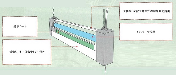 ●捕虫シートは湿度65%の環境でも、液ダレしない特殊粘着剤を使用しています。 ●捕虫シート一体虫受トレー付きなので、捕獲後の虫の落下も防止でき、シートに粘着した虫も、水平下方から見えず不快感を与えません(メーカー特許出願済み) ●天板なしで配光角270°の広角強力誘引、ホコリも溜まらず食品に混入の恐れもありません。 ●インバーター採用でランプのチラツキもなく省エネ仕様(メーカー比8%)でグローもなく、省メンテ仕様にもなっています。 ![]() ■仕様