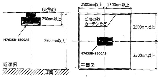 ■寸法図 ![]() ■取付位置 ●使用するとき部屋などの広さ、高さは下図を目安に設置してください。 ●から2.5mの範囲内には、カーテンなど燃えやすいものは近づけないでください。 ![]() |