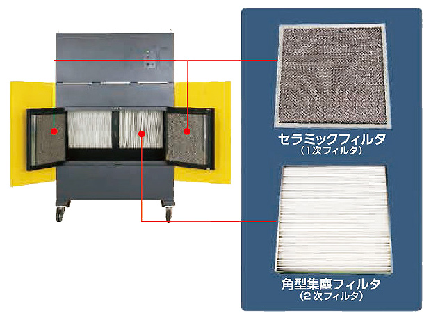 | グラインダーの削りカスなどを安全に回収。お持ちの作業台に添わせてご使用いただけます。 M812K-31Mは現状お使いの作業台に本集塵機を添わせて、グラインダーの削り塵など研磨による微細な粉塵を安全に回収し、作業場内をクリーンな状態に保つ集塵機です。 従来ある作業台付集塵機は作業台まで付いているため、限られた作業しか行うことが出来ませんでした。しかしM812K-31Mは作業台が付いていないため、いろいろなサイズの作業台に対応しておりますので、使いやすさが実感できます。 また金属粉を集塵しますので、火花浸入対策をしっかり行っており安全にお使いいただけます。 ![]() ■特長 ●様々なサイズの作業台に対応 ご使用中の作業台をそのまま利用できます ●移動が容易 キャスター付きなので、移動や設置が容易です。様々な工場レイアウトの変更、移転等にも対応が可能です ●多重構造でフィルタに引火防止 衝突板+セラミックフィルタにより、火花や静電気による引火を防止します ●高性能フィルタで捕集 刃物のように尖った微細な鉄粉は、作業者の手や目を傷つけるだけでなく、作業場の汚染にもつながります。高性能フィルタにより、微細な粉塵を安全かつ効率的に捕集し、作業場内をクリーンな状態に保ちます ![]() ●簡単清掃 背面の扉よりエアーガンを使用してフィルタを清掃できます。フィルタの取り外し不要でエアーガンは集塵機内部に向けて吹くので、清掃時に工場内が汚れません。 また取り出しやすいダストボックスで捕集塵の清掃も簡単です ●左右のフードが粉塵飛散防止 飛散防止フードを左右に取り付けることで、作業場への粉塵飛散を防ぎます。 加工する品の形状に合わせて、覆う部分が調整できます ![]() ■各部位説明 ![]() ■仕様