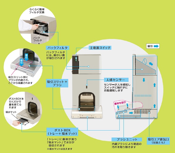 靴底に付着した塵埃をブラシとエアー吸引により、溝の中まで強力に吸塵します 粘着マットの代替、補助に最適です |