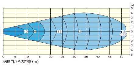 ■特長 ●平均粒子径(霧の平均サイズ)が10~30μmの霧を噴霧、送風ファンにより広範囲へ冷気を拡散する省エネ冷房装置 ●霧が蒸発する際の気化熱により、周辺温度を3~5℃冷房。 ●設置場所を選ばないポンプ・水タンク付きタイプ(移動式カートタイプ)。 ●熱中症対策や粉塵対策などの用途に好適。 ●噴霧流量56.6L/hr(6MPa時)、大規模空間での利用に好適。 ■使用用途 冷房:対人冷房・熱中症対策、高温対策 加湿:粉塵対策、乾燥対策、健康対策 [製造工場/加工工場] ・作業者の熱中症対策、乾燥対策 [廃棄物処理場/リサイクルセンター] ・構内粉塵対策、作業者の熱中症対策、健康対策 [体育館/武道場/サッカー場/テニス場/競技場] ・アスリートの熱中症対策、暑さによる練習効率低下防止 [車両基地] ・点検整備時の高温対策、作業者の熱中症対策、作業効率・整備品質の向上 [卸市場/食肉加工場] ・構内の対人冷房、産業動物の熱ストレス対策 ■風速分布(50Hz/60Hz) ![]() ■仕様