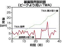 | 小型軽量で、作業シフトの間中ポケットに入れて作業可能な ポケット型VOCモニターです ![]() ■特長 ●小型軽量で、作業シフトの間中ポケットに入れて作業可能 ●PIDランプとセンサーは、工具なしで簡単にメンテナンスできるよう短時間で分解可能 ●手袋を付けたままで操作可能な大型キー ●日本語を含む12言語対応 ●読み取りやすいバックライト式ディスプレイ ●1分間隔で最大3ヶ月分のデータを格納し、データログ機能(オプション)でPCへダウンロード ●STEL、TWA、ピークを含む各種アラーム条件に対応して変化するアラーム信号 ●10.6eVランプと9.8eVランプが使用可能 ![]() ●本機は、ポケットサイズでデータログ機能(M961GM-ST2911Sのみ)を搭載した光イオン化検知器(PID)です。この小型サイズで、揮発性有機化合物(VOC)の最大12時間の連続および瞬時モニタリングが可能になります。 用途としてはVOCの存在する作業現場での個人用連続モニターとして使い、TWA、STEL濃度による警報で作業者に知らせます。 作業者はVOC濃度がTWAより低い環境で作業し、STEL濃度警報が出たら作業者はその現場を離れる必要があります。このように作業者の健康と安全を守るための検知器です。 ●ログデータをグラフ化した例 ![]() ■化学物質のリスクアセスメント対策 労働安全衛生法の改正(2016年6月施行)より、一定の危険性・有害性が認知されている 化学物質に対するリスクアセスメントの実施が事業者の義務となります。 有機溶剤に関わるリスクアセスメント及び対策には、VOC検知器がお役に立ちます。 ![]() ■TWA 値、STEL 値、および天井値の定義 一般的に、TWA値は最小値、STEL値は、それより大きな値、天井値は最大値となります。 天井値とは、瞬間的にも超えてはいけない濃度です。 STEL 値とは、直前の15分間の移動平均濃度です。 瞬間濃度は、天井値を超えない限り、STEL値を超えてもかまいませんが、 15分間の移動平均はST EL 限界を超えてはなりません。 STELアラームレベルに到達したら、作業者は少なくとも1時間、STELレベルの暴露から離れる必要があります。 ![]() ■仕様