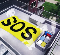 建物の屋上にMB21B-300SKを設置しておけば、緊急避難時に救援隊に発見されやすいSOS表示の救助要請表示幕やヘルメットといった、生命を守る為の災害グッズをまとめて安全に手に取る事が出来ます。