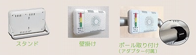 ●オフィス、教育・公共施設などの活動空間やリビングルーム、子供部屋などの居住空間に。 ●見えないPM2.5が、光と音のレベルでわかる! ●9段階のLEDと2通りのブザーで、PM2.5濃度を2秒間隔*でお知らせ。 ●日本製センサー内蔵。 ●スタンド/壁掛けポール取り付け(アダプター付属)対応の多彩な設置スタイルだから、置き場所選びもすぐ決まる! * ACアダプター使用時、充電池動作時は10秒間隔。 |