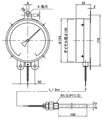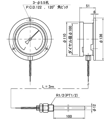 | ■特長 ●離れた場所の温度を測定する液体封入式の堅牢な工業用温度計です。 ●外面の金属部は全て SUS304 製 ■寸法図