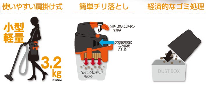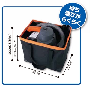■特長 ・付属のキャリーバッグに一式収納 ・電源単相100V ・ホース径Φ30 ![]() ![]() ●使いやすい肩掛け式 ベルトを肩に掛けて使用する事で取り回しに優れ、清掃・移動が楽に行えます。 ●簡単チリ落とし 吸込み口を塞いでボタンを押すだけで、目詰まりを解消する簡単チリ落とし機能内蔵。 ●経済的なゴミ処理 タンクに直接ゴミが溜まるので紙パックなどのランニングコストがかからず経済的です。 ![]() ●まとめて持ち運び・収納 付属のキャリーバッグに一式全て収納できますので持ち運びに便利です。 省スペースに収まるので、棚への収納や、車での持ち運びが簡単にできます。 ![]() ![]() ■現場清掃の流れ ![]() ■付属品 ![]() ■仕様