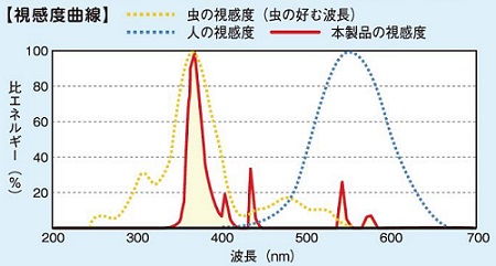 | ■特長 ●強力な光で虫を誘引 蛍光灯の約100倍以上の紫外線で虫を誘引。 有効範囲は60㎡(約37畳程度)と広すぎません。 ![]() ※昼間は太陽光に含まれる紫外線により、場所によっては誘虫効果が得にくい場合があります。 ●ファンで吸引するので静かで安全。清潔、安全、静か(34.4㏈) ・光でおびき寄せた虫を、ファンの強力な気流で吸引し、下のカゴに捕獲します。 ・ファンによる吸引式なので、「バチバチ」という電撃音がせず、非常に静かで使用場所を選びません。 ・静かなので、真夜中や、赤ちゃん、ペットのそばでも安心して使えます。 ●ランニングコストが安い 目安:1時間あたり約0.4円(1kw=27円/hで計算) ●光触媒効果 ランプの紫外線と、内部に塗布した酸化チタンが反応することにより、空気中の有機物(臭いのもとや、菌、ウイルス)や捕獲した虫の死骸を分解する際にごく微量の二酸化炭素の発生が期待されます。 ![]() ※酸化チタンの光触媒効果は半永久的に持続します。 ●虫が簡単に捨てられる 吸引した虫はカゴの中で乾燥した状態で死んでいる為、こびりつかず、簡単にゴミ箱に捨てられます。 ※捕虫してすぐなど、まだ虫が生きている場合もあります。 ●捕獲した虫を逃さない スイッチをオフにするとファンの回転が止まり、連動して風圧シャッターも閉じるので、スイッチをオフにしても虫が逃げ出しません。 ■使用場所 オフィス・玄関・キッチン・ベットそば・飲食店ノフロア・飲食店の厨房・ホテル、旅館、学校や保育施設・病院・コンビニなどの店舗・農家などの作業場・工場、倉庫 など ■仕様