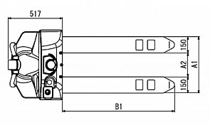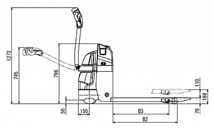 | ■誤動作防止 ハンドルの角度によって走行が出来なくなる、誤動作防止機能が付いています。 ※これは、停止している状態で不意に走行レバーに触れてしまい突然動き出す事を防ぐためです。 ![]() ■大きな操作ボタンで操作ラクラク 走行ボタンがハンドルの中心にあり、右利きの方にも、左利きの方にも楽にお使いいただけます。 ※操作パネル上部の赤い部分は、操作される方の為の挟まれ防止装置になっています。 この赤いボタンが押されると、走行が一旦停止してフォーク方向に動き始めます。 ![]() ■安全性 走行速度は、負荷時3.5km/h、無負荷時4km/hで設定しております。 ご発注時にご指示いただければ速度を落とした状態に調整して出荷できます。(有償) ※メーカーの安全規定により、4km/h以上に設定する事は出来ません。 ■カーブ減速装置 全速の状態でカーブを曲がると荷物が不安定となり荷崩れとなる事が有ります。 より安全に使用して頂くため一定以上の角度にハンドルを回転させると速度が約半減し危険を減らすことが出来ます。 ■寸法図 ![]() ![]() ■仕様