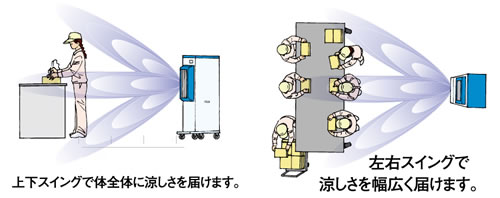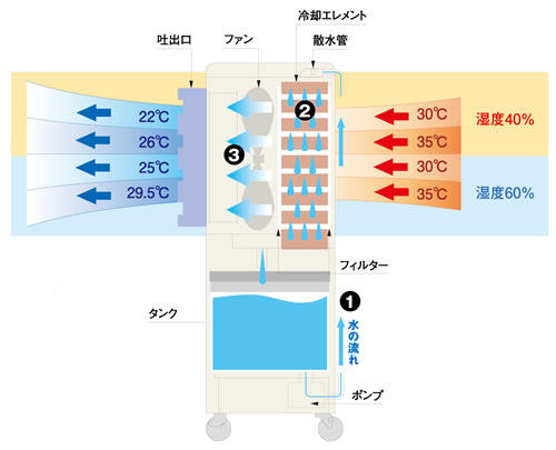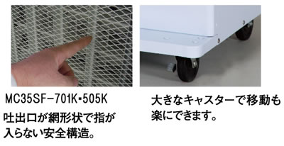 ・消臭パックを標準装備。 消臭パックはニオイの発生を抑え、水回りを清潔に保ちます。 1個で約1ヶ月効果が保たれます。 ![]() ●排熱なし スポットエアコンのように排熱が出ることがありません。 ![]() ●高い安全性 吐出口が網形状で指が入らない安全構造。 大きなキャスターでラクラク移動。 ![]() ■夏場の節電は空調電力削減から ![]() ※MC35SF-405Kはこちら ■暑い時ほど、性能を発揮。 ①タンクの水をポンプでくみ上げ、冷却エレメントに注ぎます。 ②冷却エレメント内の水は空気と接触し、気化します。 ③冷却された空気は大型ファンにより遠くに送られます。 ・涼風のしくみ ![]() ■大型モデルMC35SF-701K ![]() ●驚愕の涼風到達距離30m! MC35SFシリーズの大型モデル。 涼風の到達距離が、従来の2倍以上!(30m) 上下左右のオートスイングで、広い工場内などで大活躍! ●特長 ・タンク容量80L自動給水機能付 ・オフタイマー搭載1・4・8時間 ■広さと用途に合わせて様々なシーンで大活躍 広さと用途に合わせて選べる充実のラインナップ。熱中症対策や部品の冷却などに効果的です! ![]() ■タイプ