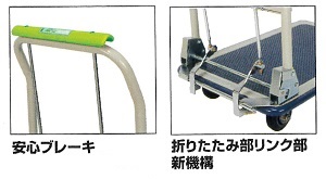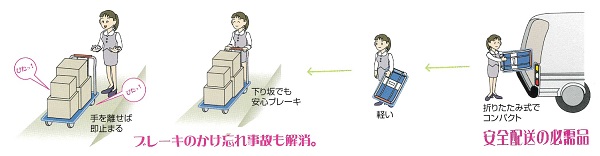 ■特長 ●折りたたみ式でコンパクト、軽い、安全配送の必需品 ●離せば即止まる、下り坂でも安心ブレーキ、ブレーキのかけ忘れ事故も解消 ![]() ●ハンドルを折りたたんだときにもブレーキが作動、自動車に乗せての移動も安全 ![]()