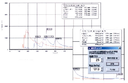 | ■概要 ●揮発性有機化合物=VOC(Volatile Organic Compounds) VOCとは、「常温で液体や固体の形でも存在しうる極めて揮発性の高い物質」を意味しており、その種類も非常に幅広く、 日常生活の中でも頭痛やめまい、アレルギーなど、微量でも人体に悪影響を及ぼすと言われています。 室内環境で問題になるVOCとは100種類以上の物質の集合体であり、広い意味では自然界に存在する天然の物質も 「化学物質」でありWHO(世界保健機構)が定義するVOCに該当する物質も多く存在します。 ※TVOC=総揮発性有機化合物…VOCの総量 ●VOCの人体への影響 VOCは室内の空気汚染の主な原因と言われている物質で、室温で簡単に気化するという特徴をもっています。 VOCの人体への影響については、一般的に刺激となり、くしゃみや涙、気道狭窄、 ぜんそくなどを誘発することがあると指摘されています。 発生源は、化学合成された石油製品が中心で、家の内装材や掃除用品、洗剤などにも多く見られ、 内装材のように何ヶ月もかけてゆっくりと気化するものもあり、室内では長時間じわじわと放出されるために、 常に微量のVOCが存在します。 ■特長 ●同時個別測定が可能 トルエン、エチルベンゼン、キシレン、スチレンモノマー、パラジクロロベンゼン、TVOCの同時個別測定が可能です。 (約17分/回) ●操作が簡単 メニュー画面から【測定】を選択して測定画面に移り、【開始】ボタンを押すだけで簡単に測定できます。 ●電源があれば測定場所を選びません 必要なユニットは本体に内蔵しているので、本体を置く場所とAC100Vの電源があれば、いつでも何処でも測定できます。 ●データ記録・連続測定が可能 MC5HV-1000J本体で、10回分の結果が記録可能。また、最大10回まで連続測定が可能です。 MC5HV-1000J専用自動計測アプリケーションを組み合わせれば、クロマトグラムデータの記録が可能になります。 ●その場でモニタリングできます 条件を変えての換気による室内VOCの低減効果や、壁や床付近の空気をガスシリンジ等で 採取して測定することによってVOC発生源の確認が容易に行えます。 ●公定法分析のサンプリングポイントの決定にも役立ちます 学校や病院など多数の測定箇所があるケースでは、 公定法分析を依頼するポイントを決めるためのスクリーニング測定に最適です。 これにより、これまで難しかった全箇所のVOC測定が実現できます。 ●各測定結果は濃度で表示 各成分は、そのクロマトピークを演算しμg/m3濃度で表示されるので、面倒なクロマトグラム処理は不要です。 ●トラップ管(採取管)が脱着可能 トラップ管は簡単に脱着できるため、トラップ管とガスシリンジ等を組み合わせて試料ガスを採取すれば、 電源のない室内空気の測定も可能になります。 ●小型チャンバー法に対応 建材からの有害物質放散量を定量する方法としてJIS化されている「20g小型チャンバー法」に対応した測定が可能です。 これにより容易にサンプルの目安を確認できるため、全てをGC/MSに掛ける必要がなくなり、効率的な試験が可能になります。 ■外観図 ![]() ![]() ■検出原理 ![]() MC5HV-1000Jは、VOC濃度をモニタリングするために、 固相吸着剤を充填した脱着可能なトラップ管(サンプリングカラム)による濃縮システムと ガスクロマトグラフ有機物検出器として多くの実績のあるFID検出器に相当する、高感度半導体を検出器に採用しました。 これにより室内レベル濃度のVOC分析を可能にすると共に、キャリアーガスに圧縮空気を使用する事で 高圧ガスボンベを不要にしたパックドガスクロマトグラフシステムを可搬型のケースに収めました。 測定開始とともにサンプリングポンプがスタートし 約1分間で100mgまたは、10分間で1gのガス中成分を固相吸着剤に濃縮します。 次にトラップ管をヒーターで150℃以上に加熱し3つのバルブを同時に切り替えて 離脱した成分をキャリアーガス中に注入(インジェクト)後、カラムで成分を展開します。 TVOC測定用検出器は検知された全成分を測定対象としTVOCとして演算します。 さらにカラムで展開された成分はVOCs測定用検出器で個々の成分としてピーク処理し濃度演算します。 成分注入を終了したトラップ管はパージのため、継続して加熱状態を保って精製空気を通した後、 ファンデ空冷して次のサンプリングに備えます。 なお、ガスクロマトグラフはGC-MS分析のように特定成分に的を絞って測定できないため、 多くのVOC成分が存在する生活環境や作業場などでの測定では、 カラムで完全分離が出来ないため計測値が他成分の影響を受けて高く出ることがあります。 ■仕様