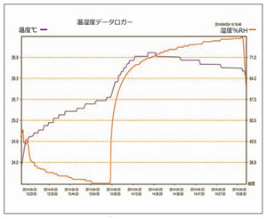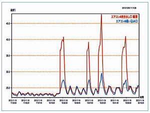 空調設備の性能試験及び評価 製品開発時における各種実験・検証データの収集、教育教材 ■温湿度管理の応用編 : 複数のデータロガーで記録~同一グラフ上で比較・検証 ●空気センサーでエアコンの温度コントロールの状況判断 エアコンの吸込口・吹出口の温度データを取ることにより、リモコンの設定温度と相違なくエアコンが動いているか否かの状態を知ることができます。(ロガー2個仕様) ●右下グラフはエアコンの吸込口・吹出口の温度データを同一グラフに表わしたものです。