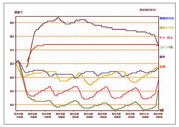 下のグラフは6個のデータロガーで温度データを記録し、オフィス内外の温度変化を立体的に検証したグラフです。 測定場所:事務所中央、鍵ボックス、サーバーの上、コンピューター室、屋外、玄関 ![]() ■付属品 ![]() ■仕様