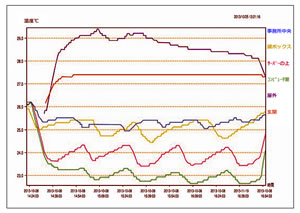 ![]() モーター、ポンプヘッドの温度上昇を記録 複数のデータロガー(※)で記録すれば、同一チャート上に各部の温度や変化をグラフ表示でき、 時系列上での相対的な温度変化比較や互いに及ぼし合う影響等を検証できます。 ※最大6台まで同一チャート上に表示できます。 ●内部温・液体センサー