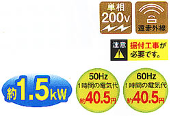 | ■特長 ●空気を汚さない遠赤外線ヒーター。体に吸収されやすい遠赤外線効果で、体の芯から暖めます。 ●屋内の開放的な空間でも快適に暖まることができるので、幅広い場所でのご使用ができます。 ●床置きが狭くてできない作業場や工場に最適。 ![]() ■赤外線の優れた特徴 赤外線はおよそ4~1000μm(マイクロメーター)の電磁波のことをいい直進性が強く、熱が物質に吸収されやすい特徴をもっています。 しかも人間の体の中から効率よく温まります。 さらに風の影響を受けないため、解放された開放された空間でも有効に活用できます。 ![]() ■静かでクリーンな暖房機。ファンの音が無いので静かです。 空気を無駄に暖めることなく対象のみ集中的に温めます。 赤外線が体に吸収され直接芯から温まるため、快適な温かさを実感できます。(サーモグラフィー測定※当社にて) ![]() ■使用環境に合わせて「天井吊り」「壁掛け」自由自在。 ![]() ■スイッチ標準付属 ※電源コードはついていません。接続工事が必要です。 ![]() ■外気が直接吹き込む空間など、スポット的に無駄のない運転で対象のみを集中的に温めます。 ![]() ![]() ![]() ![]() ![]() ■寸法図 ![]() ![]() ■仕様