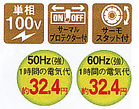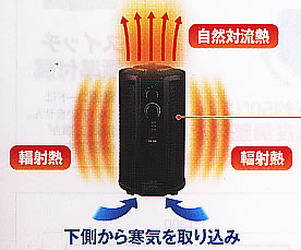 | ■特長 ●ファンを使わない暖房器なので、音が静かで、お部屋のホコリを巻き上げることがありません。 ●発熱体を絶縁物であるマイカ(雲母)で挟み込んだ即暖性の高いヒーターを採用。 ●円状に配置したヒーターによって、本体下側から寒気を内部に取り込み、ヒーターの間を通過させることで本体上部から自然対流熱が発生。さらに、全面から輻射熱が放出することで体や壁などに浸透し、芯から暖まります。 ●温度調節は、600W・1200Wの2段階に調節可能。 ●万が一転倒時でもスイッチがOFFになる安全設計。 ![]() ![]() ■サーモスタット(自動温度調整器) 周辺の温度によってON・OFFを自動的に切り替え、無駄な暖めすぎを防ぎます。 ※通電は電源を「切」にしないと切れません。 ![]() ■マイカヒーターの特長 熱線を絶縁物であるマイカ(雲母)で挟み込んだ即暖性の高いヒーター。 円状に配置したヒーターによって、本体下側から寒気を内部に取り込み、ヒーターの間を通過させることで本体上部から自然対流熱が発生。 さらに、全面から幅射熱が放出することで全方向暖めます。 ![]() ![]() ■寸法図 ![]() ■仕様