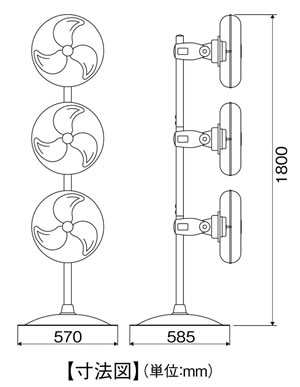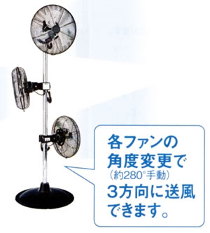 各ファンの送風角度を変更できるので 1台で3方向に送風できる トリプルファン ・単相100V ・アルミ3枚35cm羽根 ・首折れ4段階 ・風量3段階 ・サーマルプロテクター付 1時間の電気代 50Hz:約3.2円 60Hz:約3.2円 |