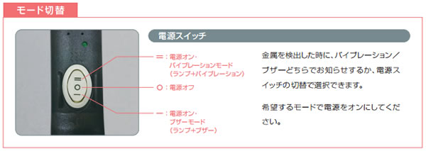 ■製品画像![]() ■特徴 1.金属の検出をバイブレーションもしくはブザーでお知らせします。 従来品は、金属の検出をランプとブザーでお知らせしていました。 ME30M-9VNは、電源スイッチの切替でバイブレーションモード/ブザーモードの選択ができるようになりました。 バイブレーションモード時に金属を検出すると、ランプとバイブレーションでお知らせします(※)。 音を出したくない環境や、音が聞こえにくい環境でのご使用に最適です。 ※バイブレーションモードを選択すると、ブザーは鳴りません。 ![]() 2.コイル誘導式のハンド式金属探知器です。 3.すべての金属を検出します。 アルミニウム、ステンレス、金、真鍮などの非磁性体、 鉄などの磁性体など、すべての金属を検出します。 4.最適な状態に自動初期設定をします。 ASC-N回路が、電源スイッチをオンにした後の3秒間に、その場所に最適の状態に自動で初期設定します。 検出することが可能な距離に金属がある状態で電源スイッチをオンにすると、 検出ランプ(赤)の点滅とブザーの間欠音もしくはバイブレーションでエラーを告げます。 5.検出時の赤ランプは使用時に自然と目線がいくリングの近くに設けてあり、視認度が高くなっています。 6.感度は3段階で設定できます。 簡単な操作で検出感度を3段階にセットできます。 設定感度は電源スイッチをオンにした時、ブザーもしくはバイブレーションの回数で確認できます。 ※工場出荷時は最高感度に設定されています。 7.バッテリーは、市販の9V角形乾電池(006P)を使います。 定格電圧が8.4Vの充電式乾電池も使えます。 8.電池交換の時期をお知らせします。 バッテリーアラーム(ランプ、ブザー/バイブレーション)は2段階で電池交換のタイミングをお知らせします。 ●ブザーモード時 ・電源ランプ(緑)点滅 →電池交換近い(金属の検出動作をします) ・電源ランプ(緑)点滅+ブザー間欠音 →即時交換時期(金属の検出動作はしません) ●バイブレーションモード時 ・電源ランプ(緑)点滅 →電池交換近い(金属の検出動作をします) ・電源ランプ(緑)点滅+バイブレーション間欠振動 →即時交換時期(金属の検出動作はしません) 9.日本製です。 高性能高品質です。 落下などによる故障にも、輸入品と違いスムースなメンテナンスが可能です。 ■外観図 ![]() ![]() ■仕様